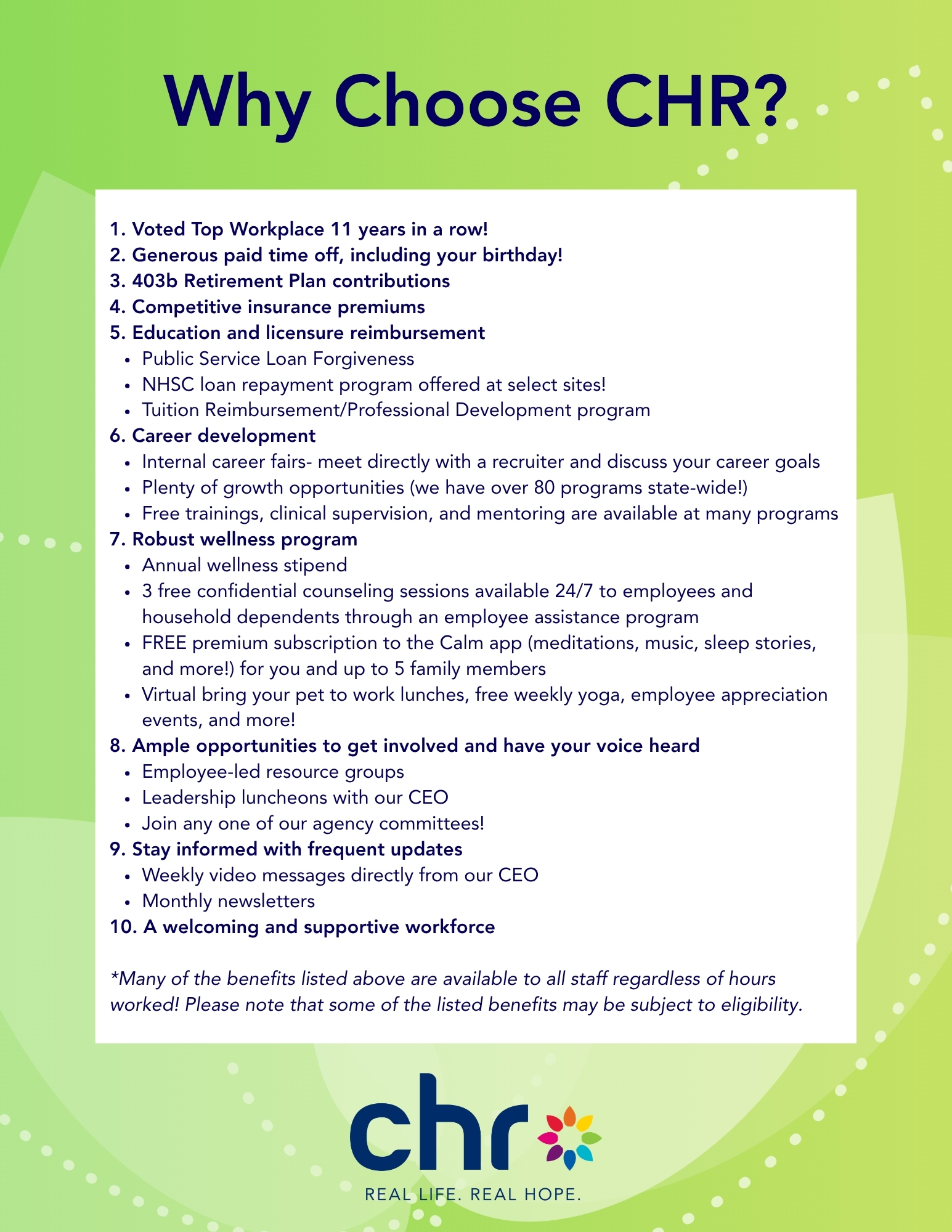 *Many of the benefits listed above are available to all staff regardless of hours worked! Please note that some of the listed benefits may be subject to eligibility.
